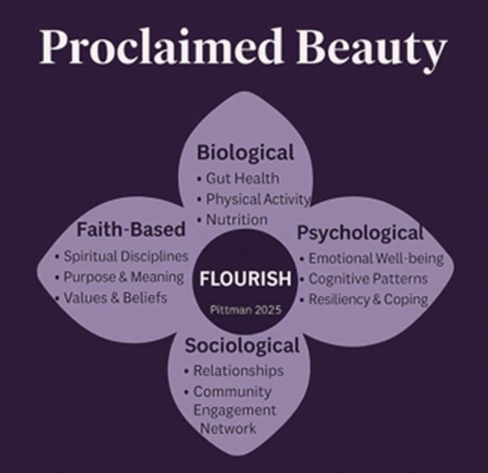 Everything we do at Proclaimed Beauty™ is built upon the Flourish Framework™, a holistic model developed by Dr. Diana J. Pittman. This framework nurtures growth across eight dimensions - Foundation, Lifestyle, Outlook, Understanding, Relationships, Integrity, Service, and Health - helping individuals and organizations live whole, lead well, and flourish fully.